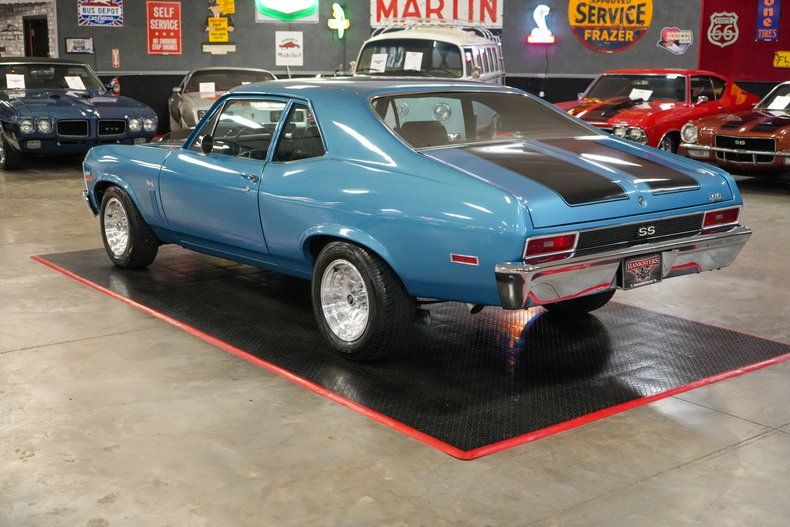 This 1972 Chevrolet Nova is a serious street machine built for performance. Powered by a 350 Small Block Chevy V8 with aluminum heads, it's backed by a TH400 automatic transmission and a 12-bolt POSI rear with aggressive 4.11 gears. Long tube headers, an Edelbrock aluminum intake, Brawler 4-barrel carburetor, HEI ignition, and aluminum radiator enhance power and reliability. Equipped with power steering, power brakes, and front disc brakes, it offers confident control. The black vinyl interior keeps it classic, while 15-inch American Racing Outlaw wheels and staggered Cooper tires complete the stance. Finished in blue with black stripes, this Nova means business.