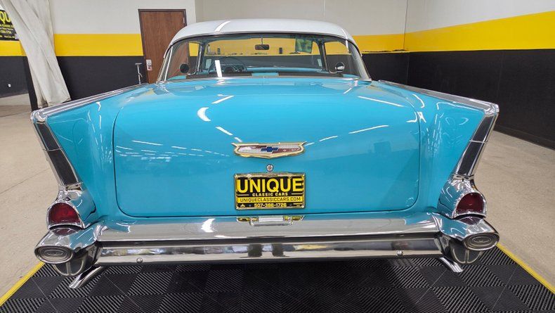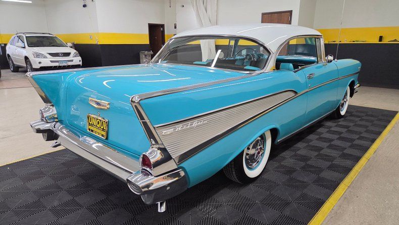 1957 Chevrolet Bel Air in India Ivory and Tropical Turquoise two-tone paint with matching turquoise wheels.