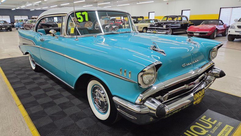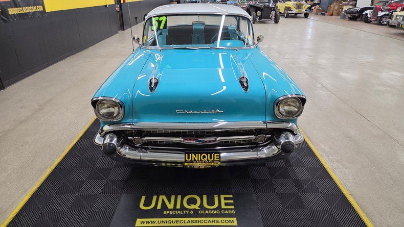 1957 Chevrolet Bel Air two-door hardtop. A genuine Bel Air. Two-tone color scheme-India Ivory on the upper body and Tropical Turquoise on the lower-with matching turquoise wheels. Powered by a 327 cubic inch V8 engine rated at 300 horsepower, paired with a rare and engaging four-speed manual transmission. Well-maintained chrome trim, bumpers, and brightwork, nice straight body panels, with minor touch-ups and aged spots. The turquoise steel wheels feature tri-spinner wheel covers and wide white-wall radial tires dated 2020, contributing to its authentic look. Equipped with power steering and dual exhaust, and comes with extras such as halogen headlamps, the original radio, a car cover, and some trim pieces. Inside, the Bel Air offers a beautiful black and turquoise interior that appears well-preserved, with no rips or tears in the upholstery. The headliner is intact, dome light functional, and visors are in place. There is an aftermarket tachometer on the steering column and a vintage-style gauge cluster mounted beneath the dash, all of which are operational. Featuring working wipers, radio, turn signals, and blower motor. Out on the road, responsiveness, smooth clutch, great acceleration and comfortable handling, reinforcing its suitability for local shows, cruises, and classic car events.