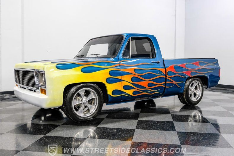 There's something about a custom classic truck that instantly transports you to another era, and this 1980 Chevrolet C10 Custom does it the moment it hits the street. Rolling down Main Street in its custom blue paint with hand painted flames front to back, a sleek front valance, rear roll pan, and tinted glass, this truck turns every head. The side opening tailgate and bed tonneau cover add unique flair, while the lowered stance and 18-inch wheels wrapped in 255/55R18 radials give it a confident, ready to run look. Whether you're drawn to its bold style or the nostalgia it carries, this C10 invites you to make new memories while cruising in a piece of true Americana.
