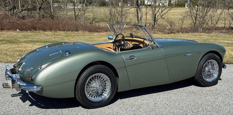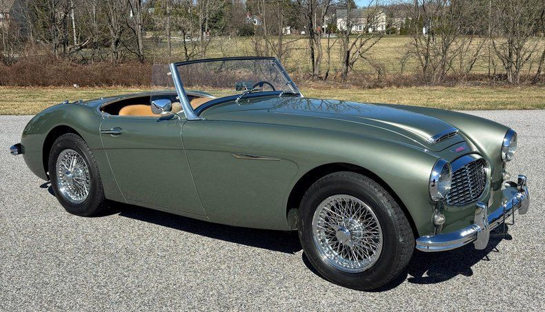 1959 Austin Healey 100-6 BN6 Roadster, beautifully restored, gorgeous Smoke Green paint, excellent Black soft top, gleaming chrome and trim, immaculate Tan leather interior, smooth and powerful 2900cc 124 HP 6-cylinder engine, upgraded to a fully syncromesh 5-speed overdrive transmission, stainless steel dual exhaust, chrome knock-off wire wheels, Vredestein radial tires, runs and drives wonderfully!