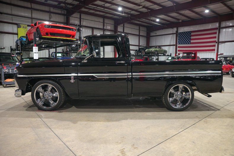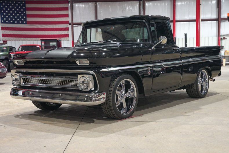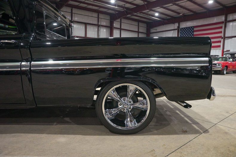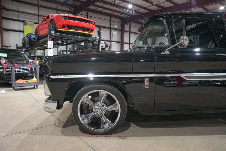 GR Auto Gallery is excited to present this fully restored 1963 Chevrolet C10 finished in deep Axalta Black with Axalta Chromatic SS style stripes and matching side molding. This truck has been transformed into a true show and go build, combining classic styling with modern performance and detail work throughout. The exterior is loaded with fresh chrome including new bumpers, bezels, and trim, while a 1964 grille adds a subtle custom touch. Sitting on 20-inch wheels with a lowered stance from 2.5-inch drop spindles up front and a 3.5-inch drop in the rear, this C10 has an aggressive, dialed-in look. The oak bed in the rear adds a beautiful contrast to the black paint, while the Candy Apple Red Chevrolet badging and tailgate logo give it just the right pop.