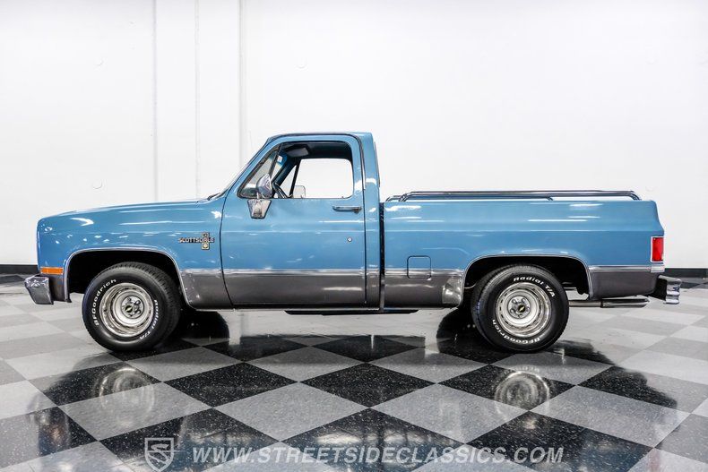 Sliding behind the wheel of this 1984 Chevrolet C10 Scottsdale is about more than getting from point A to point B-it's about enjoying a classic pickup that delivers real presence and capability. Finished in a sharp two-tone Light Blue and Dark Gray repaint, this C10 features a painted bed, bedside rails, chrome bumpers, and a sliding rear window that adds both style and function. Its lowered stance, paired with factory steel wheels wrapped in 275/60R15 BFGoodrich radials, gives it a confident, street ready look that turns heads at the car show and commands attention on the road. This is a truck built to be driven, enjoyed, and remembered.