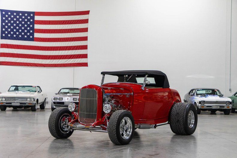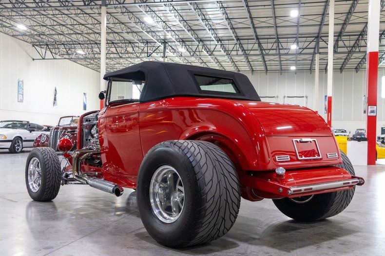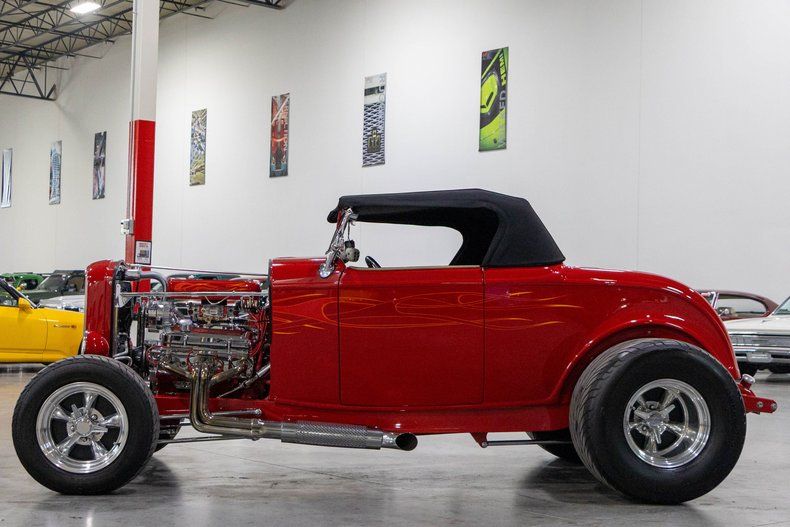 This 1932 Ford Roadster is a no-nonsense hot rod that perfectly captures the spirit of classic American performance with a modern, show-quality build. Finished in a deep, high-gloss red, the car presents extremely well with a laser-straight body, excellent panel fitment, and a black soft top that complements the aggressive stance. The look is completed with a de-chromed, minimalist rear and an unmistakable hot rod profile, highlighted by massive 31x16 Mickey Thompson rear tires that give the car an incredibly planted, muscular presence from every angle.
