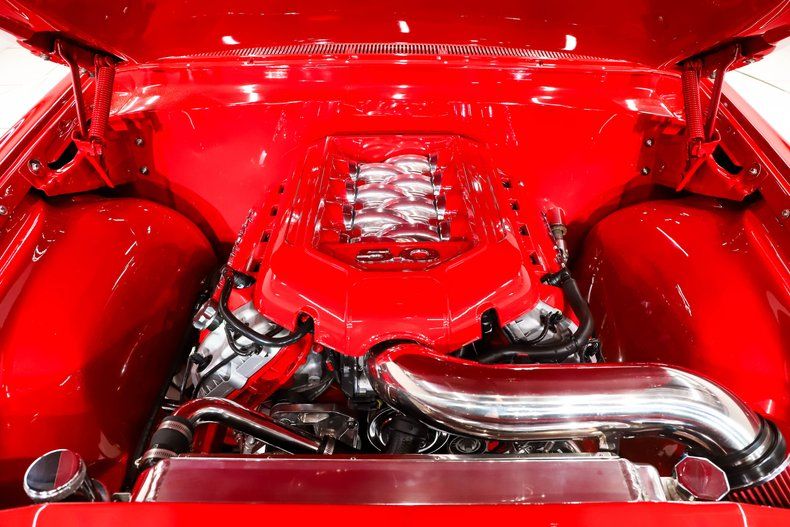 INTERIOR: The interior is beautifully designed and expertly executed. The upholstery is all ultra leather which has a very soft feel. The metal trim is painted in the same "red glass" finish as the exterior. The dash has been completely smoothed and features a custom lower panel housing the A/C controls and vents, along with modern red digital gauges. A polished tilt steering column is topped with a very deluxe steering wheel. The door panels are fully custom molded and include square-weave, Mercedes-style carpet along the lower sections. The flooring and custom mats are made to match. There are bucket seats front and back separated by a full-length center console, which houses the modern shifter, cup holders, stereo system, and RideTech air ride controls. The tunes are played through speakers in the doors and custom rear shelf. Above, a molded custom headliner looks amazing. Comfort features include power windows, power seats, an electronic throttle pedal, and a custom brake pedal-blending modern convenience with high-end custom craftsmanship.
