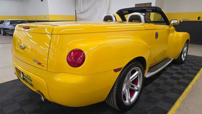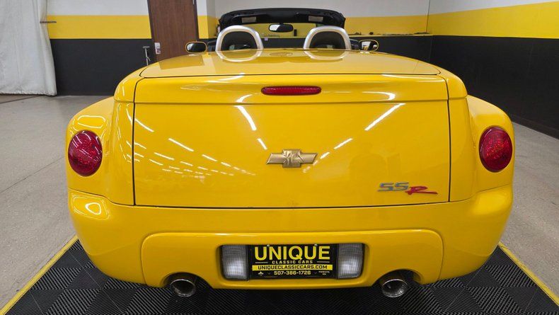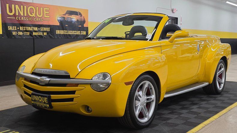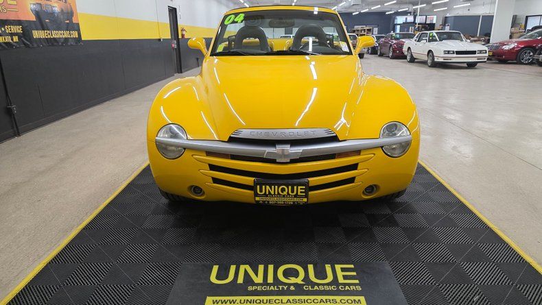 2004 Chevrolet SSR, in yellow paint. This vehicle is a unique blend of vintage styling inspired by early 1950s Chevrolet pickups and modern performance features. It has a retractable hardtop convertible roof, a 5.3 L V8 engine paired with an automatic transmission with overdrive, and is equipped with power steering, power brakes, and air conditioning that blows cold. The SSR's exterior paint shows a nice shine with only minor imperfections. The interior features ebony leather bucket seats, a center console, power seats with heating and memory settings, power windows, power locks, and a Bose stereo system. The leather seats show natural wear but remain in good condition, and the cabin includes steering wheel controls for the stereo and information center, a tilt steering column, and cruise control. The truck rides on stock Goodyear radial tires and is equipped with a fully functional dual exhaust system that produces a deep, throaty rumble. The retractable hardtop functions easily, with smooth operation of the power top and tinted side and rear glass. On the road, smooth acceleration, braking, and handling, making it a fun and responsive vehicle to drive.
