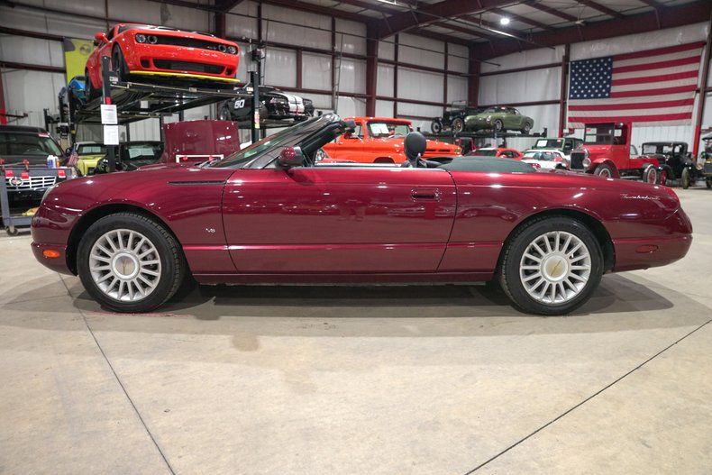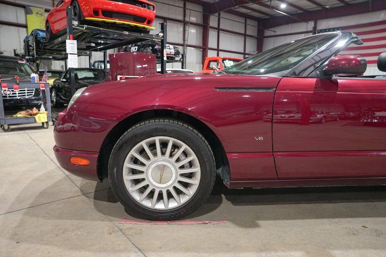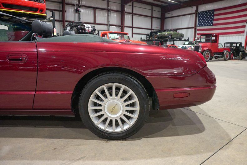 GR Auto Gallery is excited to present this 2004 Ford Thunderbird Convertible finished in rich Merlot paint over a Black leather interior. This retro inspired design pays homage to the original Thunderbirds of the 1950s while incorporating modern comfort and technology. The deep Merlot finish highlights the car's smooth, rounded lines, and the 16 inch silver wheels complement its elegant, laid back styling. With both a removable hard top and a soft top included, along with a hard top cart and the factory top tool, this Thunderbird offers versatility and convenience for open air cruising.