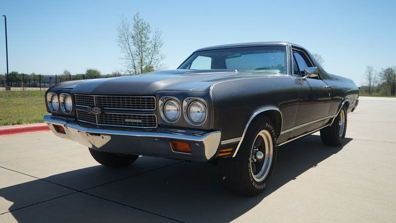 The 1970 El Camino featured a one-year-only front-end design with quad headlights and an aggressive stance, sharing much of its DNA with the Chevelle SS of the same year. This example carries the SS-inspired styling cues including the cowl-style hood and badging, giving it the look of Chevrolet's legendary Super Sport models that defined peak muscle car performance.