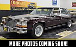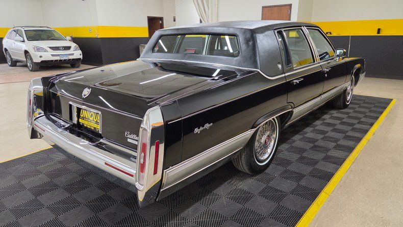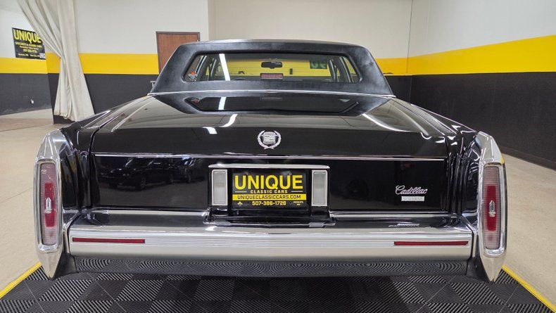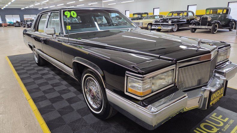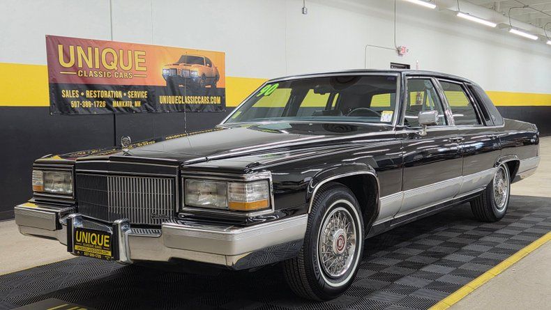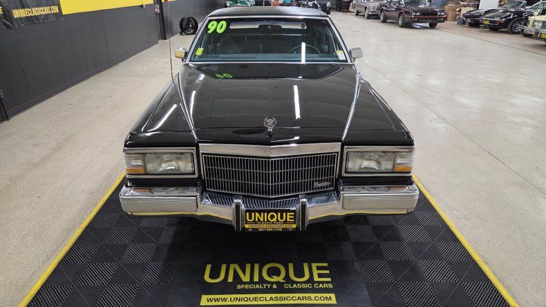 1990 Cadillac Brougham De'Elegance. The Brougham De'Elegance is positioned as one of Cadillac's top-tier offerings. Under the hood, a 5.7-liter V8 engine paired with a 700 R4 automatic transmission with overdrive, ensuring smooth and efficient driving. Just over 63,000 original miles, with power steering and power brakes. Gloss black paint with a mirror-like finish, chrome accents on the grille and bumpers, and well-maintained body panels free from major dings or scratches. The vinyl top does show some wear on the top. Brand-new rear tires and nearly new front tires dated for 2025, with Cadillac wheel covers. Inside, the Cadillac features a gray leather interior with minor creasing on the seats typical of leather aging. A padded, comfortable seating experience with power-adjustable seats, windows, locks, and remote mirrors. The cabin includes a digital dashboard, wood grain accents, and a cold-blowing air conditioning system that has been updated from the original R12 refrigerant to R134A. Recent service includes a new water pump, and rear wheel cylinders. The radio dial requires some delicate adjustment to operate. On the road, the Cadillac delivers a quintessential smooth, quiet, and luxurious ride reflective of Cadillac standards.