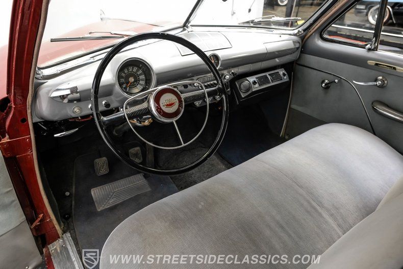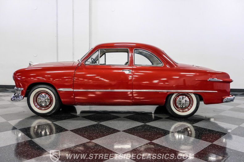 Dressed in tasteful red paint, and cruising on a set of whitewall tires that are perfectly in keeping with its thoroughly original appearance, this 1950 Ford Club Coupe captures American automotive styling at an interesting point in its evolution, a time when cars were pairing down from the substantial fenders and prominent roof heights of the '40s and becoming more streamlined, while riding lower to the ground. Its complete collection of body trim is still intact, and as you move to get a lateral view of this classic, you can easily see how its uninterrupted body lines and integrated fenders represented a dramatic aesthetic departure from its Ford counterparts that had debuted only a couple of years earlier.