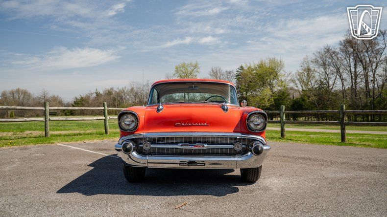 Gateway classic cars of Nashville is proud to digitally present to you this stunning 1957 Chevrolet 210, finished in a head-turning Matador Red exterior that radiates vintage charm. As you approach, the gleaming custom wheels and white wall tires catch your eye, blending retro style with a touch of modern flair. The dual exhaust system, equipped with Flowtech mufflers, hints at the power waiting under the hood, while the radial tires promise a smooth and confident ride.