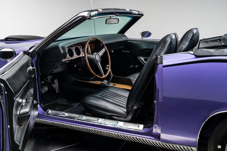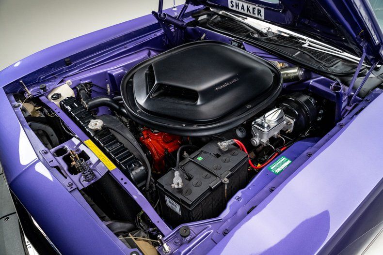 The exterior is finished in In Violet Metallic, one of Chrysler's High Impact colors, and is complemented by correct HEMI 'Cuda visual elements. The body was refinished during the restoration and features a Shaker hood, HEMI-style side graphics, and a black convertible boot. Exterior details include a redline grille, chrome bumpers, integrated fog lamps, and correct badging. Brightwork and trim present in restored condition, with stainless moldings, factory-style mirrors, and rocker trim consistent with the car's intended appearance. The car rides on 15" Rallye wheels fitted with Goodyear Polyglas tires, maintaining a period-correct stance and presentation.