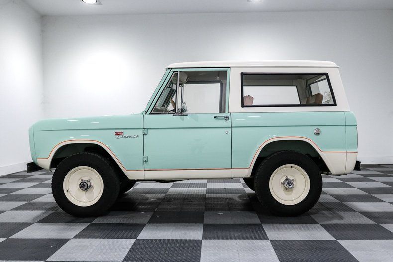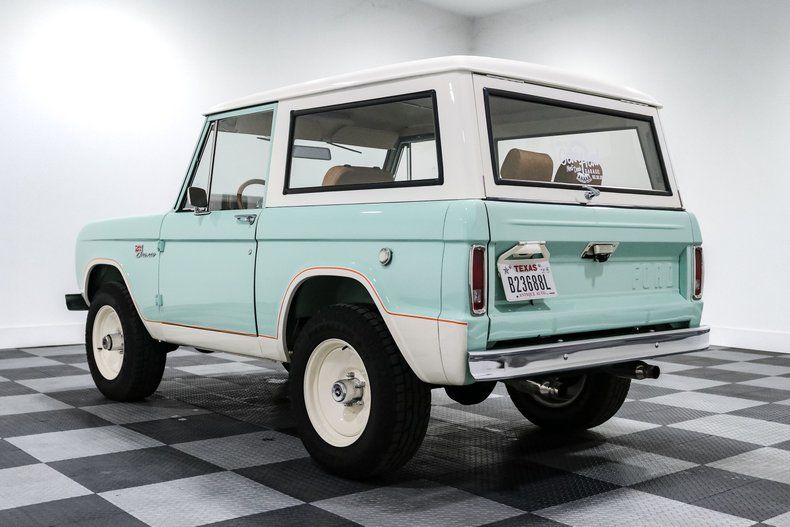 Finished in a striking custom two tone teal over a rich brown interior, this Bronco hits that perfect balance between vintage grit and modern refinement. The uncut rear fenders keep its original proportions intact, while 17 inch smoothie wheels and factory hubcaps nod to its heritage without losing attitude. The removable hardtop and insulated top make it just as ready for a weekend cruise as it is for a trail run.