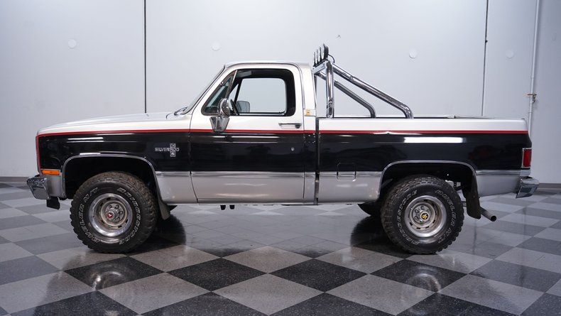 Dressed in an ultra-sharp paint scheme that combines black and silver with red accenting stripes, and equipped for action from front to back, this 1985 Chevrolet K10 Silverado 4x4 is one nice-looking classic pickup. The distinctive color combo really looks great in this setting and the accompanying chrome this truck wears is in very clean condition. Its sturdy roll bar is equipped with a quartet of spotlights to illuminate the road ahead in more challenging situations and the cabin glass is as clear as you could want. Take a look in back and you'll also see that the truck bed liner has done its protective duties well, without sustaining any noticeable damage itself. Better still, along with its aesthetic impact, this Silverado offers a level of drivability that's not easily found in its segment.