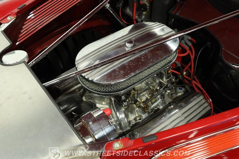 Inside the doors is a comfortable, well-appointed interior, with two-tone upholstery covering a pair of contoured bucket seats and matching door panels to each side. Climb in, lower yourself into position, and you'll find a set of Classic Instruments gauges on hand with parchment-colored faces and a font very much in keeping with this awesome ride's vintage identity. A Lokar shifter is perched within easy reach on the center console, which includes a pair of cupholders that will come in handy during longer journeys. A Jensen AM/FM/CD stereo with an auxiliary port is also on hand to offer plenty of audio options as you embark on those journeys.