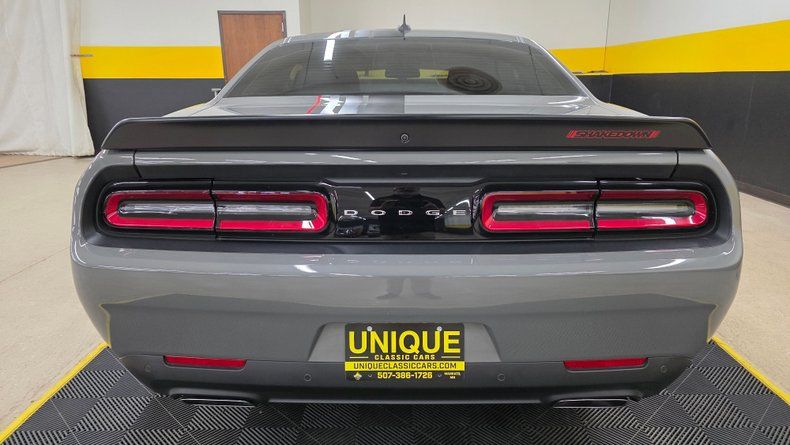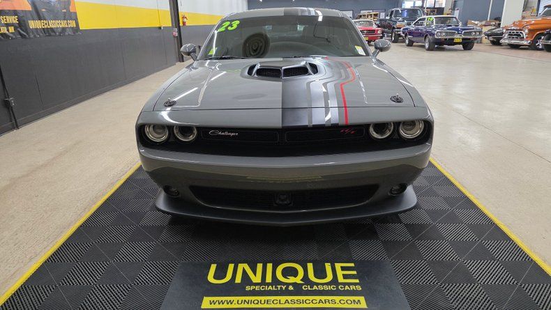 LOW MILE 2023 Dodge Challenger Shakedown Special Edition, with Scat Pack. ONLY 921 MILES on the odometer! Destroyer Gray paint with Nappa/Alcantara performance ventilated bucket seats embroidered with the Scat Pack logo, confirming it has the Scat Pack RT package. The car includes a host of premium features such as heated and ventilated seats, a premium stitched steering wheel, Brembo six-piston brakes, and the 392 cubic-inch (6.4L) HEMI V8 engine paired with an eight-speed TorqueFlite automatic transmission, with auto stick and paddle shift capability. The Shakedown Special Edition package brings unique styling elements like the shaker hood, flat black and red highlighted stripes, hood pins, and a chin spoiler, preserving the classic muscle aesthetic with modern refinements. Exceptional condtion exterior and interior, noting tinted windows, original Pirelli tires, and a clean Carfax report. The technology suite includes Uconnect, dual climate control, launch control, line lock, active exhaust, adaptive dampening suspension (Night Dynamics package), rain sensing wipers, and active headlamp control. On the road, excellent cornering, the new-car feel, and amazing condition stand out, with a level of power available that makes it exciting to drive. Additional details such as window stickers, manuals, and hood pins (never installed) are included with this vehicle.