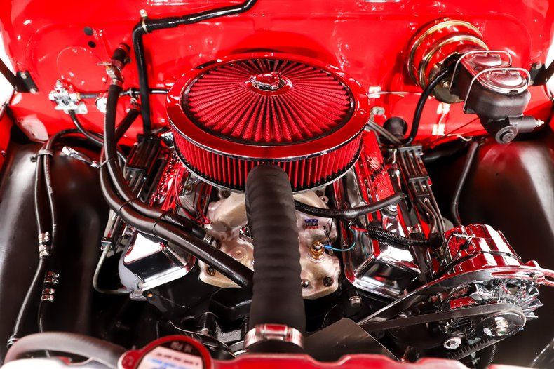 EXTERIOR: The color, stance and wheels gets this truck noticed. All metal body and fenders. It is straight, I did not find any damage or rust in my inspection. It looks like it was dipped in red nail polish with a smooth glossy bright red finish. The vent windows were removed for a cleaner look. All the glass and gaskets were replaced. Newport Speed electric wiper system. It has deluxe chrome trim around the door windows. The emblems, handles, mirrors and rear bumper look new. It has Chevrolet step plates on the running boards. LED tailights in back. It is lowered and sitting on a big set of chrome Coys wheels wrapped in performance tires.