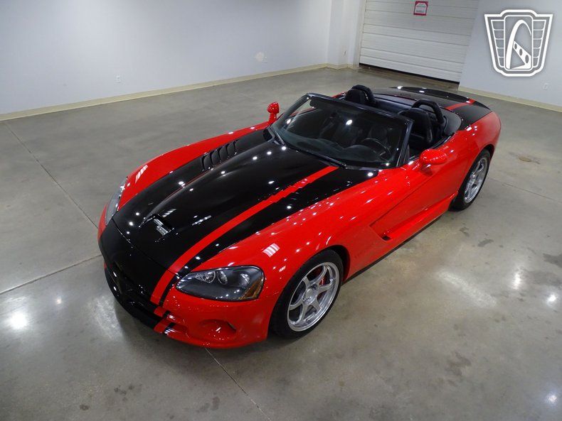 Feel the rush of adrenaline as you sit behind the wheel of this striking 2003 Dodge Viper Convertible, its bold red exterior gleaming in the sunlight. Check out the custom painted racing stripes, revealing an extra dose of horsepower under the hood. The rumble of the supercharged 8.6L (that's right, 8.6L) V10 engine fills the air as your hand grips the six-speed manual shifter, ready to unleash massive power at your command. The sleek black interior wraps around you, providing a cockpit-like experience, where every control is within easy reach. The tilt and telescopic steering wheel ensures you're comfortably positioned for the drive ahead, while the seatbelts secure you in place for the ride of a lifetime.