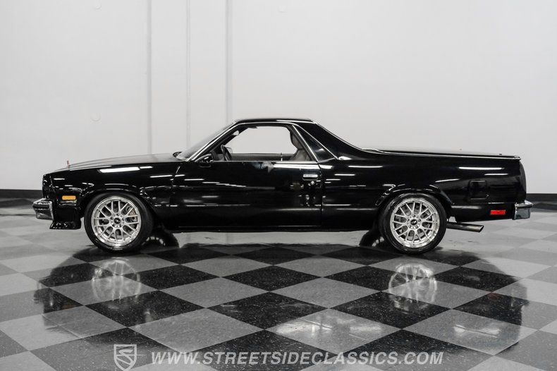 This 1984 GMC Caballero redefines classic style with a purposeful blend of vintage attitude and modern performance. Finished in jet black with a color matched hard tonneau cover, factory grille, chrome bumpers, and a painted lower front chin spoiler, it delivers a clean, aggressive look from every angle. Staggered on 18 inch ASA Revolution wheels wrapped in 265/40ZR18 Michelin tires, the stance is confident and road ready, while the bed is neatly finished with a rubber mat for practicality. As Chevrolet's rarer El Camino cousin-with fewer than 2,800 believed produced in 1984-this fuel injected Caballero stands out as a distinctive and well executed classic built to be driven and admired.