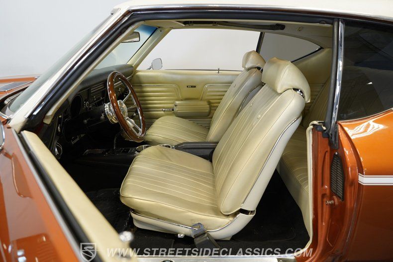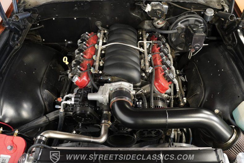 Step inside and be embraced by a beautifully crafted parchment vinyl interior that perfectly complements the exterior's fiery hue. The bench seat offers vintage comfort, while black carpeting underfoot adds contrast and depth. Modern touches like a tilt steering column with digital gauges and a RetroSound radio paired with Rockford Fosgate speakers and Bluetooth connectivity elevate the driving experience. Vintage Air climate control keeps you comfortable year-round, and the SS-style floor console with a floor-mounted shifter adds that authentic muscle car vibe with practical convenience.