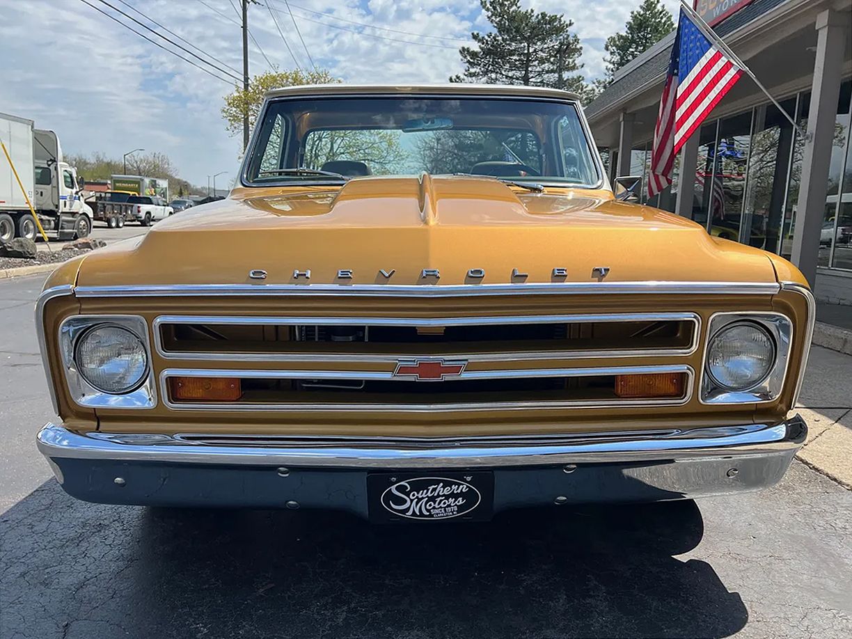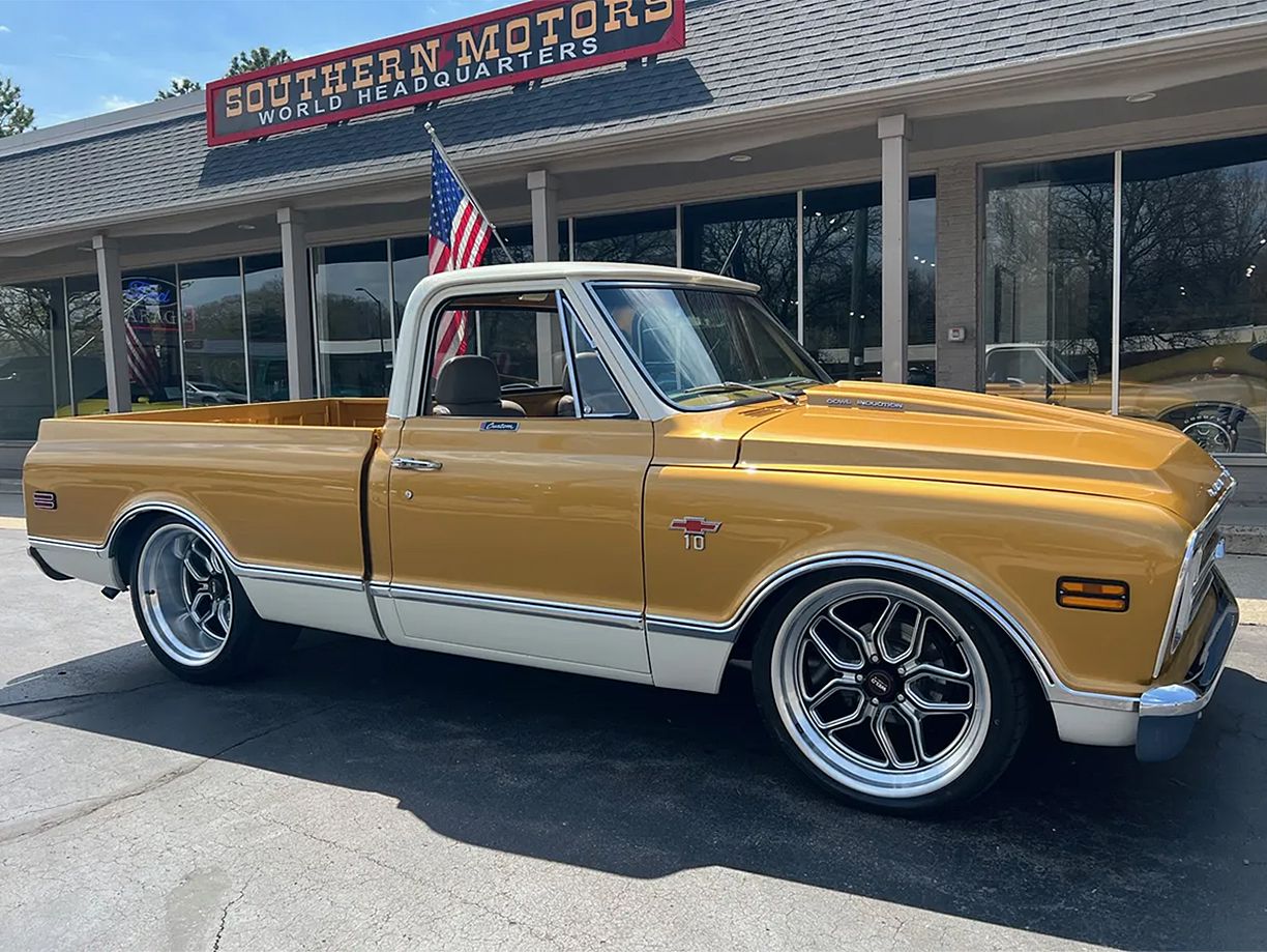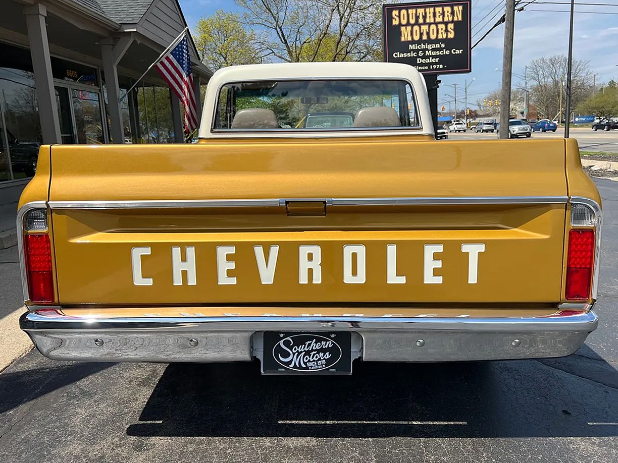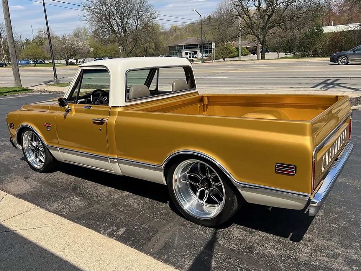 Only 300 miles on Frame-Off Restoration! Clean Florida truck, Show Quality two-tone Anniversary Gold metallic & Adobe beige paint, custom two-tone leather interior, LS7 454 ci/465 crate engine, Holley dual feed 4 bbl, polished Edelbrock Performer Air Gap intake, Hooker headers, MSD Digital 6AL ignition with GM HEI distributor, chrome air cleaner & valve covers, power steering, power front disc brakes, Vintage air conditioning, Billet Specialties front runner system, aluminum radiator with dual electric fans, professionally built 400 turbohydramatic transmission, power bucket seats with center console, chrome tilt column with billet wheel, factory tach & gauges, Audiosounds radio with custom kick panel speakers, padded dash, billet dash trim, upgraded shoulder harness seat belts, Flowmaster dual exhaust, factory rear axle with billet cover & 3.55 limited slip, custom fuel tank, 325/35ZR22 rear tires, 265/35ZR22 fronts, 22” Weld Laguna wheels, LED tail lights, Show of Go!