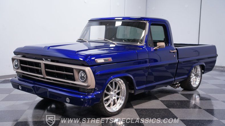 A classic truck, thoughtfully modified and tastefully modernized, possesses a unique and undeniable charm. One look at a truck like this 1972 Ford F-100 Supercharged Coyote Restomod in person is guaranteed to elicit a positive reaction from onlookers anywhere it goes. Fully repainted in a gorgeous Dark Blue Metallic, this resto-modded truck features a custom grille, badge delete, relocated fuel tank, color-matched bumper with integrated lights, custom suspension, and a modern, high-revving small-block V-8 packaged in this retro-styled short-bed workhorse.