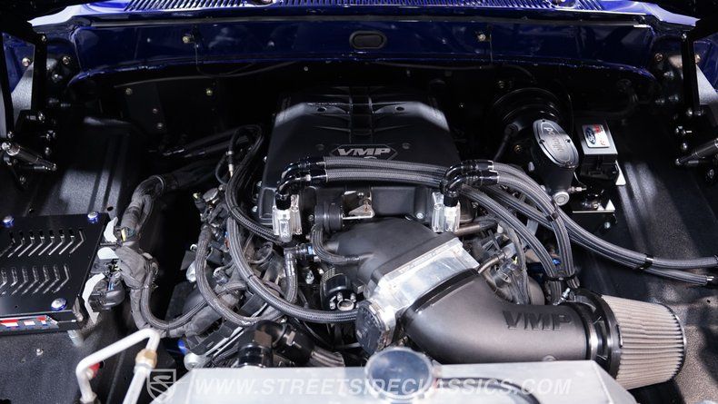 Under the hood, we find a 5.0-liter Gen III supercharged DOHC Coyote V-8 engine. Featuring a VMP ODIN blower by Magnuson, VMP cold air intake, VMP throttle body, electric cooling fans, shorty headers, and a Borla ATAK side-exit exhaust, this small block makes a very conservative 640-horsepower at the rear wheels, with plenty of power leftover. Funneled through a 10R80 ten-speed automatic transmission, those ponies are then sent to a Currie 9-inch rear end via a carbon-fiber driveshaft. Big 20-inch Rocket wheels, shod in Z-rated rubber, put power to the pavement far more efficiently than engineers half a century ago could even have dreamed of, outside of an NHRA event.