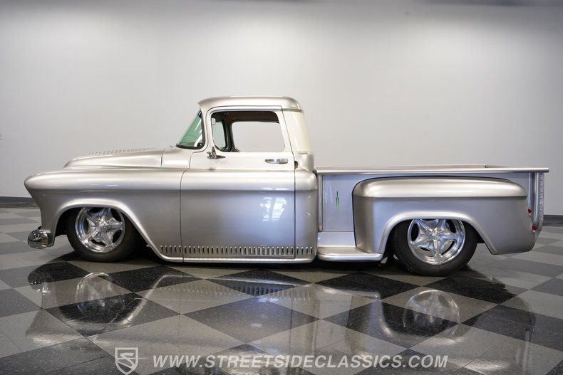 Step into a dream where classic American muscle meets custom craftsmanship. The 1955 Chevrolet 3100 is more than just a pickup; it's a rolling statement of passion and precision. With its sleek 2-inch chopped roof and eye-catching two-tone platinum pearl paint accented by green and black pinstriping, this truck is a nod to timeless style infused with modern flair. Every inch tells a story, from the pie-cut and sectioned hood to the custom bullet-style tail lights. If you crave a head-turning ride that blends vintage soul with cutting-edge upgrades, this 1955 Chevrolet 3100 demands your attention.