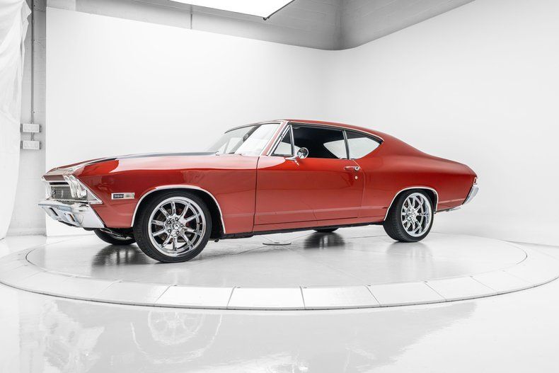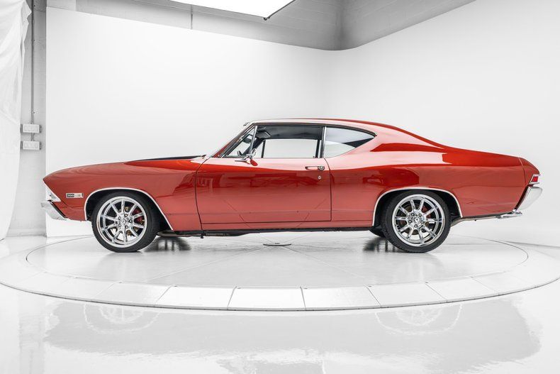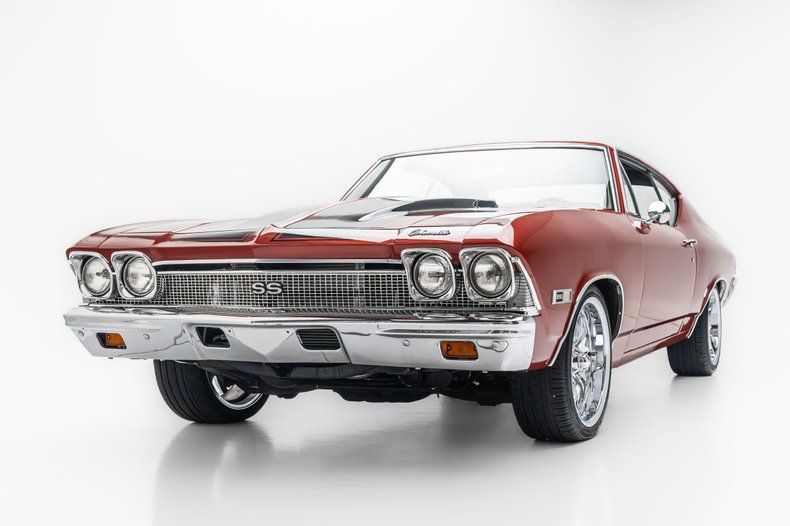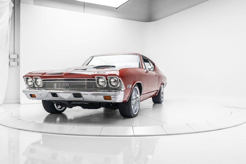 This 1968 Chevrolet Chevelle Malibu sport coupe was repainted in metallic red during a build completed in 2024, and it is powered by a replacement 396ci V8 linked to a 700R4 four-speed automatic transmission and a 12-bolt rear end. Inside, the front bucket seats and rear bench are trimmed in black vinyl and accompanied by a center console, a horseshoe shifter, Vintage Air climate control, an Equus tachometer and auxiliary gauges, and a Custom Autosound stereo connected to a Sony amplifier and a JL Audio subwoofer.