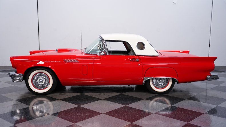 This gorgeous, highly-optioned 1957 Ford Thunderbird is an exceptional example of the thoroughly re-styled for 1957 Thunderbird that featured a new longer tail section with prominent fins. This provided greater luggage space while enabling the spare wheel to be relocated to the trunk, thus improving handling. Despite its success, the original Thunderbird concept was soon abandoned and a larger - and slower - four-seat version was introduced for 1958, a move that turned the early two-seater cars into collectors' items seemingly overnight.