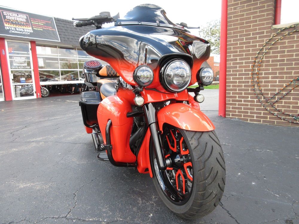 Although titled as a 2008 there is very little on this bike that is original except for the frame and the transmission. The frame has 68,871 miles on it but it received a new 120R from Wiebler’s H-D on 11/29/19 at 52,468 miles. 309 Custom Audio transformed this beauty into what you see today and finished it in 2024. The first thing they did was a Native fat tire front end with a gorgeous SMT 18X5.5” front rim with an aggressive 180mm tire. They used Dirty Air’s El Grande quick front and rear air ride with an optional ride height repeater and it has an AFK electric center stand. Bad Dad provided the saddle bag lids with integrated running lights / turn signals, 14+ stretched bags, rear fender, floor bords and tail lights. Advanblack provided the stretched tank covers, Dirty Bird Concepts provided the 8” lowers and Speed by Design provided the Funky 8 tour pak lid. The most impressive thing on this bike is by far the 4,800-watt sound system which consists of 3 SounDigital EVOX amps (2400.4, a 1600.1 and an 800.4). It has Cicada CHX65.2 Coaxial horns in the fairing as well as CHX8.2 mids in the lowers and 1” tweeters in the tour pak lid. Euphoria provided the carbon fiber 8” mid-woofers, there is a Dayton 408 DSP, Braille provided the G30 lithium battery with tender, Sony provided the water-resistant Double-DIN XAV-AX7000 head unit and it has custom speaker grills. Other notable upgrades include the Wright Customs electronic ignition, the Dakota Digital gauges, the Dominator 16” Modular bars, the black Klock Werks windshield, the Factory 47 saddle bag guards and the two-tone custom seat. The custom paint with black to orange fade really sets the whole thing off, especially with the contrast painted front rim. Before the bike saw any miles the paint was cured and professionally ceramic coated. All said and done over $40K was spent to make this gorgeous bagger what you see today. It is in excellent condition, everything works as it should and it needs nothing but a new home. We have priced it very aggressively so if you like what you see time is of the essence!