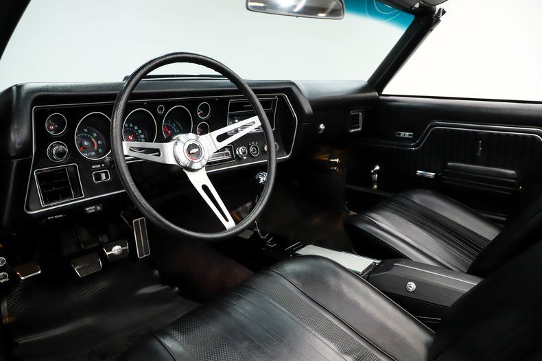 Down on the floor, nice carpet is complemented by Chevelle floor mats, a full set of seat belts, and a center console topped with a rechromed Muncie shifter. The seats have been recushioned and reupholstered, complete with all new trim for a fresh factory appearance. The door panels, armrests, window cranks, and visors have all been replaced as well. In front of the driver sits the deluxe steering wheel mounted on a tilt column, completing an interior that truly feels like stepping back into 1970.