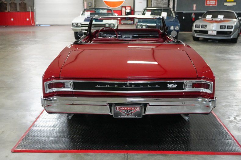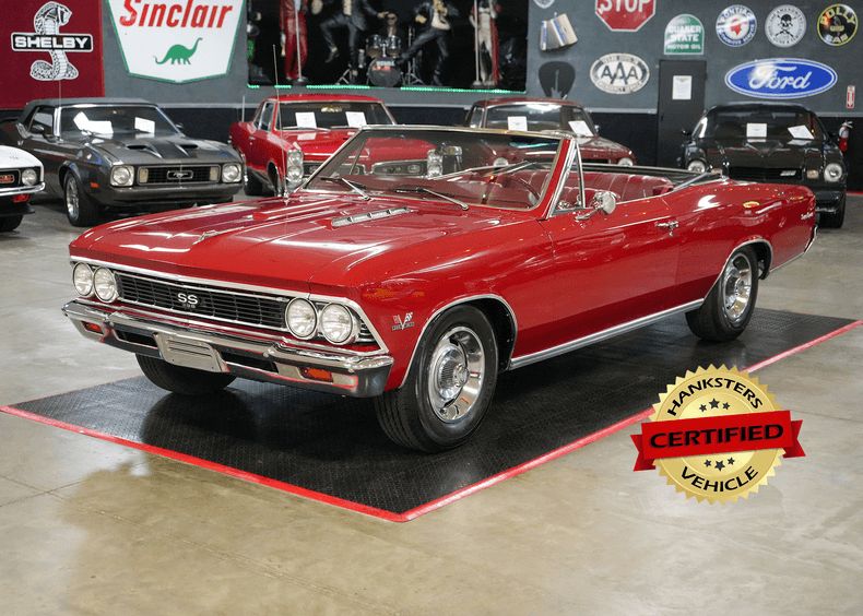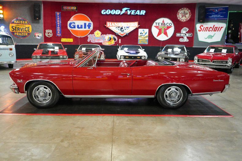 This 1966 Chevrolet Chevelle SS Convertible is a timeless muscle car powered by a 396 Big Block Chevy V8 paired with a Muncie 4-speed manual transmission for an engaging driving experience. A 3.31-geared rear end delivers smooth yet responsive performance. Finished in striking red with a black convertible top, it features a matching red vinyl interior for classic appeal. Equipped with power steering and power brakes, it offers comfortable cruising. Riding on OEM Rally wheels with Uniroyal tires, it retains its factory character with a Rochester 4-barrel carburetor and original-style components, making this Chevelle SS a true open-air muscle car icon. THIS VEHICLE QUALIFIES FOR FREE SHIPPING AND A WARRANTY!!