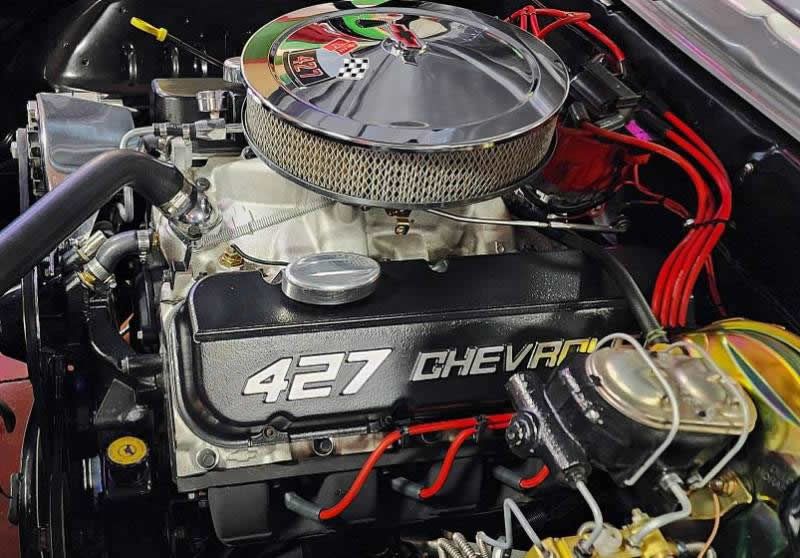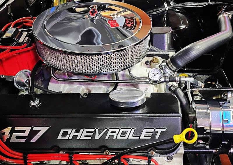 Double-throw-down L88 427 Chevy Big Block power with four-bolt main caps, hydraulic roller camshaft, aluminum oval-port cylinder heads with 2.19/1.88-inch valves make it friendly on pump-gas 10.1:1 compression ratio. Richmond Super Street 5-Speed transmission deliver the ultimate blend of performance and economy. The use of low gear ratio for the first four gears provides dramatic acceleration, while a low fifth gear provides a smooth and economical overdrive for the highway. First Gear Ratio 2.89, Second Gear Ratio 1.85, Third Gear Ratio 1.31, Fourth Gear Ratio 1.00, Fifth Gear Ratio .77. Fully synchronized for smooth shifting. GM 12-bolt Posi Traction Differential gets the job done.