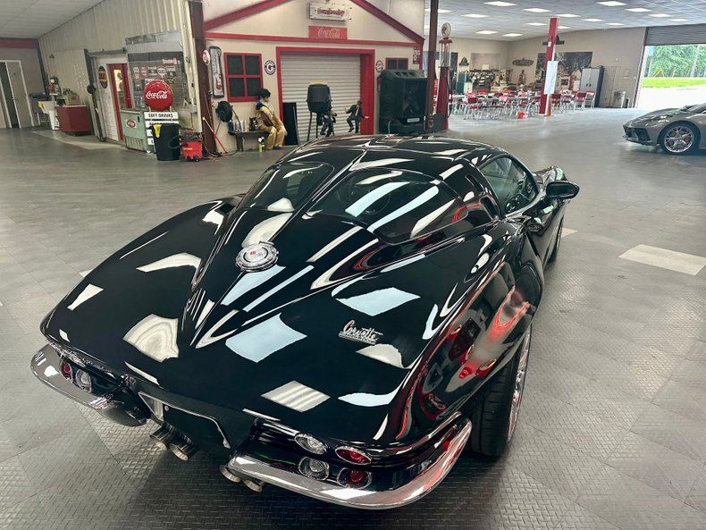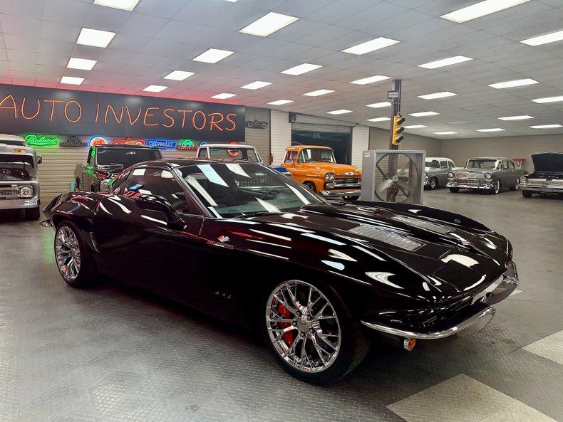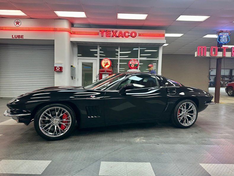 Just completed C2 Retro-Vette conversion on a super low mileage (only 10k miles) coupe. This stunning Corvette retains the comfort, safety and reliability of todays modern automobiles while embracing the classic C2 Corvette styling and appearance. The interior and all of it's features have not been altered in any way and function as factory intended. Also the chassis and drive train have not been altered or cut and sectioned in any fashion. The new C2 body was perfectly engineered to bolt in the same location as the factory fasteners and all the air bag and security sensors are still in their factory locations. This particular C2 conversion is a 1963 split window coupe and features operable flip up headlights and Z06 style chrome wheels.