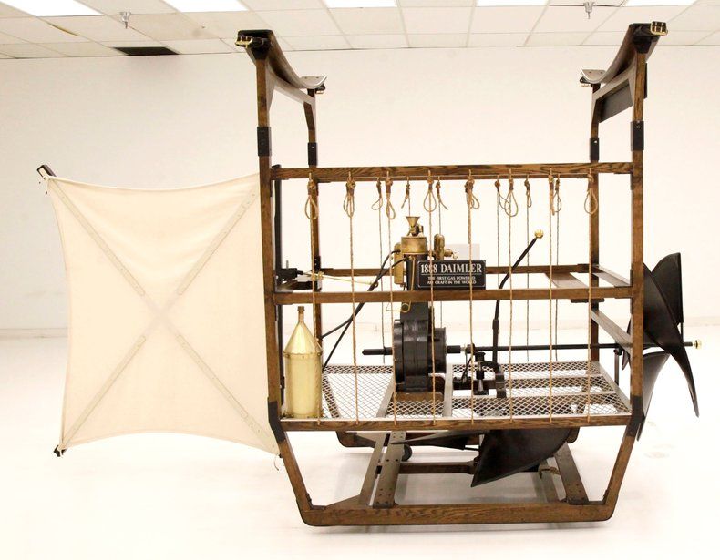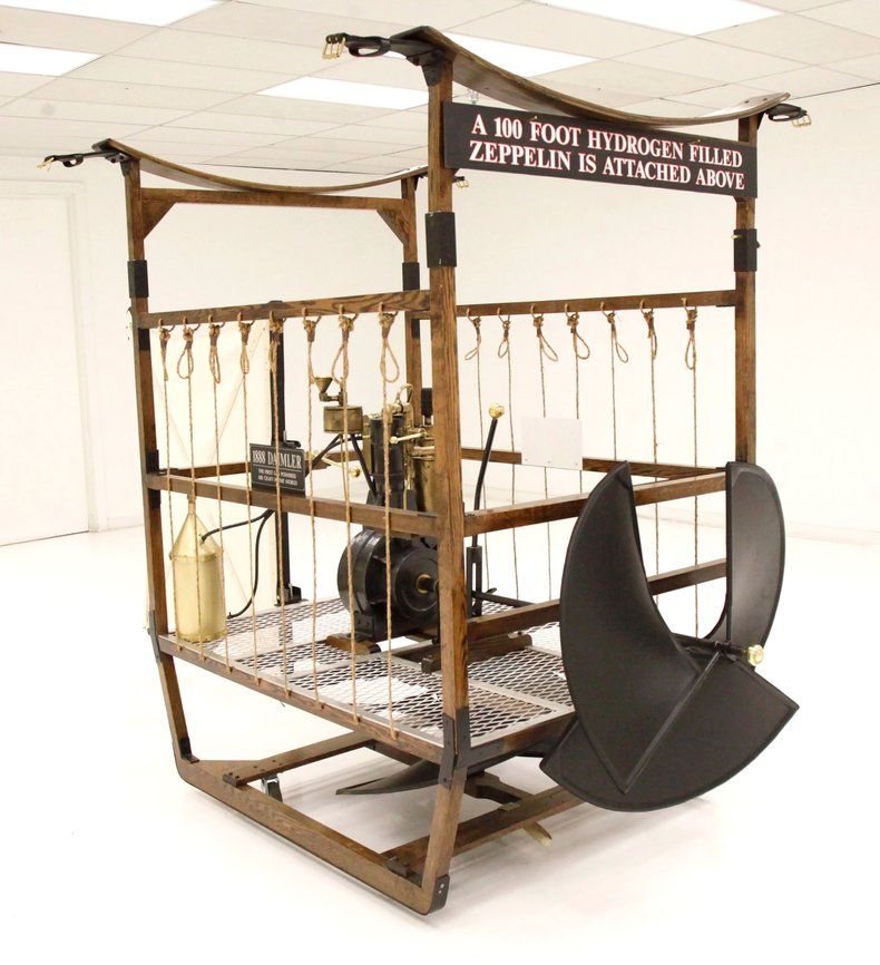 This recreation is the work of William Eggers of Goshen CT and one of many old interesting recreations to grace our Hallowed Halls. It is essentially a 150cc gas powered engine and produces 2 hp at 700 rpm. The propellers one on the bottom to control vertical movement, and the other on back controls the horizontal movement of the zeppelin. A large panel in front aids in steering the aircraft and acts as a rudder if you will.