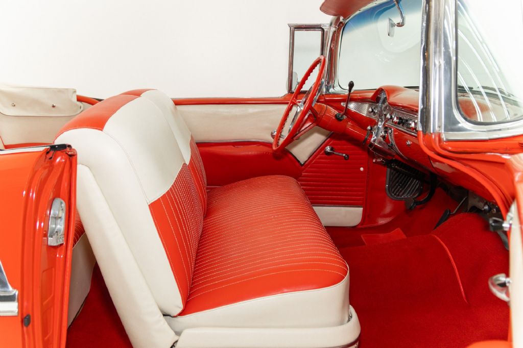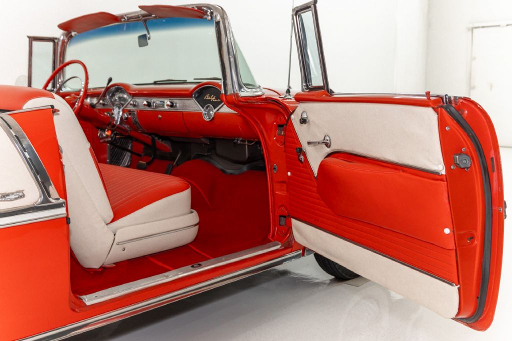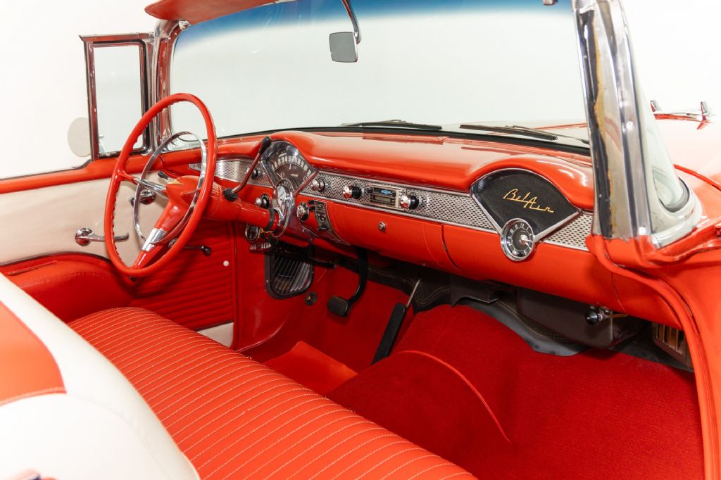 Beautiful two tone, Gypsy Red and Shoreline Beige 1955 Chevrolet Bel Air convertible with Light Ivory, Red interior and a Beige soft top. This stunning Bel Air convertible was a solid southern car; it was repainted in its very desirable original two tone colors. This has been trimmed with a good mix of new chrome and stainless. It has a well preserved original trim with lots of extras like the rear chrome continental kit, complete chrome front bumper with guards, rear painted skirts, stainless fingernail guards and a stainless fuel door guard. The paint has a bright shine and covers a rock solid southern body with good gaps and lines. This Bel Air convertible came from a large private collection in Miami, where it lived a pampered life in a climate controlled environment, was driven sparingly, and enjoyed with great care. The engine bay is highly detailed and showcases the code correct 265/205 4 bbl. engine with Powerglide automatic transmission. Upgrades were made to make the driving experience more enjoyable like power rack and pinion steering and aluminum radiator for increased cooling. The Red and Light Ivory was all new at the time of the restoration and looks amazing. The dash, gauges and original steering wheel all have the iconic look and feel that made this tri-five one of the most popular cars of all time. The trunk is correctly painted and complete with mat and jack. This American Dream Machine is rolling on new wide whites and Bel Air chrome hubcaps for timeless good looks.