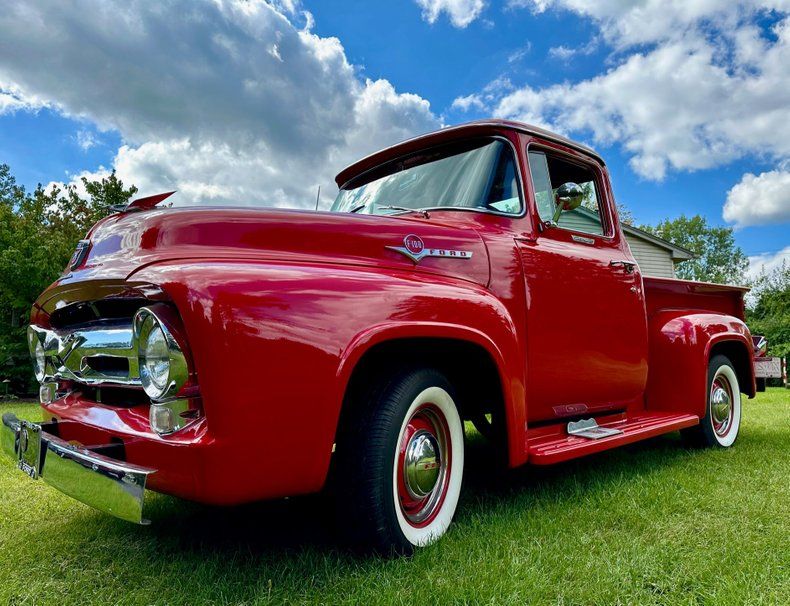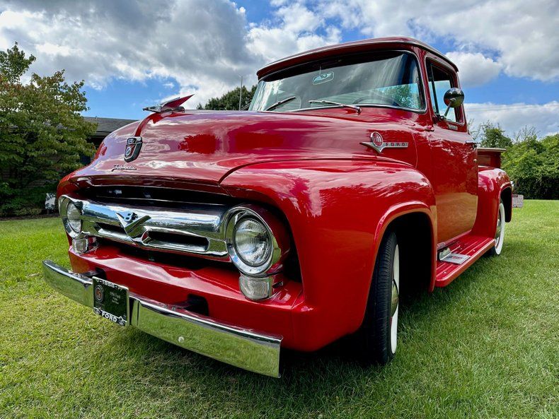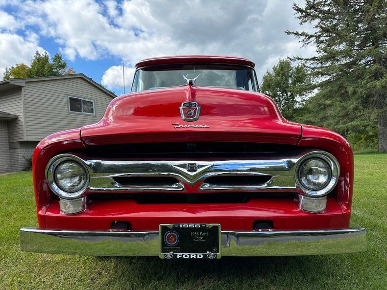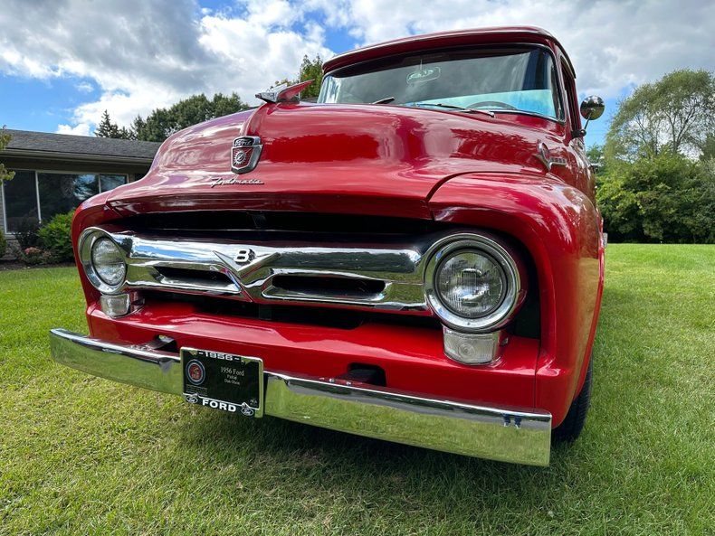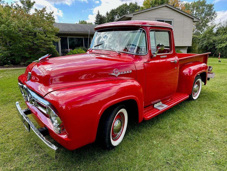 This is one of the best examples you'll find in a highly optioned '56 "Custom Cab" Pickup... Driven and Enjoyed! Equipped with the rare "Ford-O-Matic" Auto Transmission, the optional "Wrap-a-Round" rear window, the 272 Cubic Inch V8 Engine, Power Steering, a very rare AM Circular Radio (currently needing repair), Fully Chromed Front Grill and front and rear bumpers, a rare accessory hood ornament, and side step plates. During the restoration, important enhancements include Front Disc Brakes, Electronic Ignition and a high performance Distributor. The Floor in the Bed is Premium Red Oak. This truck has been invited to, and shown at the prestigious Eyes on Design event at the Edsel and Eleanor Ford estate. Additionally, it has been on national television news when President Biden spoke at the EV truck plant in May of 2021 and subsequently landed on the front pages of the Detroit News and Detroit Free Press newspapers. Currently owned by a Ford retiree and life-long Ford collector in his eighties. You'll be very proud to own and show this one. It comes with the Original Factory Owners Operator's Manual, and the 1956 Ford Service Specifications Booklet. It has traveled less than 4,700 miles since a complete restoration in June of 2016. It comes with a note book of added gas and oil changes documenting mileage and other maintenance beginning almost 45 years ago- Great documentation. This is one you won't want to miss. It is 100% ready to show, drive and enjoy.