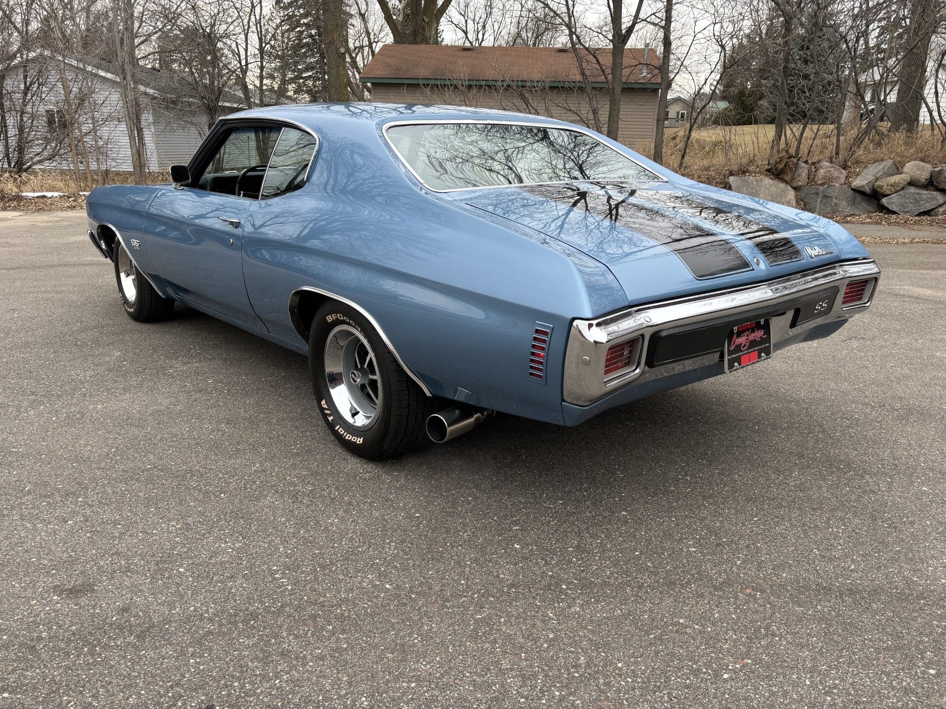 This custom 1970 Chevrolet Chevelle super sport is powered by a supercharged 6.2-liter V8 engine with 4L90E automatic transmission and 12-bolt rear axle with Auburn posi-traction equipped rear axle. It is equipped with Hotchkis front and rear control arms, shocks and sway bar suspension upgrades. The blue-painted body with functional cowl-induction hood has black SS stripes, 15-inch SS-style wheels and stock-looking Dakota Digital gauges. The car is also equipped with cross-drilled Wilwood 4-wheel disc brakes and hydro-boost assist, CFV serpentine kit, tilt wheel, bucket seats with console, RetroSound audio system with XM radio and hands-free Bluetooth, custom 3-inch exhaust with X-pipe and Flowmaster mufflers.