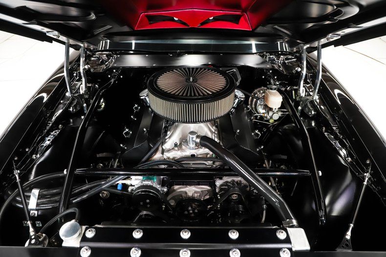 ENGINE COMPARTMENT: Pop the hood and take a minute to soak it all in! The power plant is a ginormous 537 cubic inch dyno tuned engine creating 785 horsepower and 670 ft lb of torque. It has a Dart Big M block, Callies crank, Manley rods, JE Pistons, Comp roller cam and lifters, Dart Pro 1 aluminum heads, TD roller rockers, B&B oil pump, Moroso oil pan, Edelbrock Victor intake manifold, Quick Fuel 1050 dominator carburetor, full MSD ignition, B&M remote mount oil cooler, remote mount oil filter, and a serpentine drive system. It also has a Vintage Air A/C compressor, power steering, and aluminum radiator with dual Spal electric fans. The hinges have been upgraded with Detroit speed billet units that also have struts. The firewall has been smoothed and painted a slick gloss black. The brake Master cylinder has been upgraded with a Baer unit and the intermittent wiper motor is by Detroit Speed. The roll cage comes into the engine compartment through the firewall and adds additional structural stability to the car.