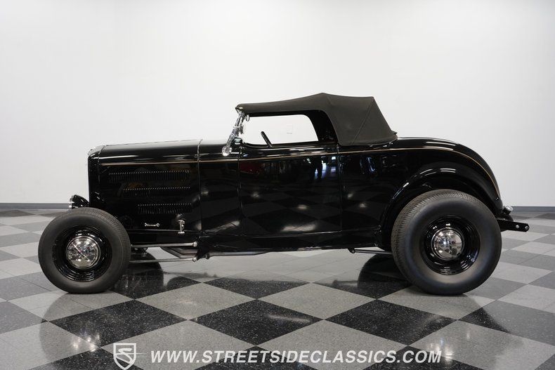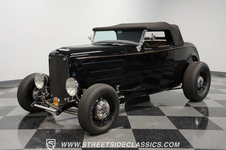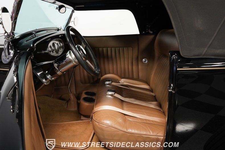 This 1932 Ford Highboy exudes a bold, unapologetic presence with its deep black paint and custom tan leather interior. It sits confidently on 15" front and 16" rear wheels, wrapped in 165/80R15 and 275/70R16 tires with a planted stance. Subtle pinstripes and blue dot taillights pay homage to the classic hot rod style, while the glossy finish reflects the car's modern build quality.