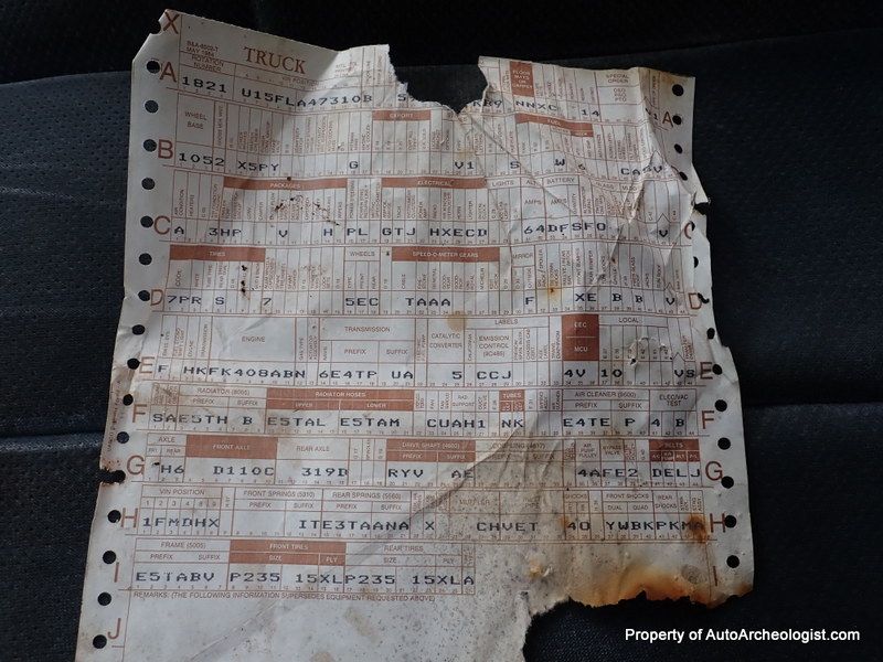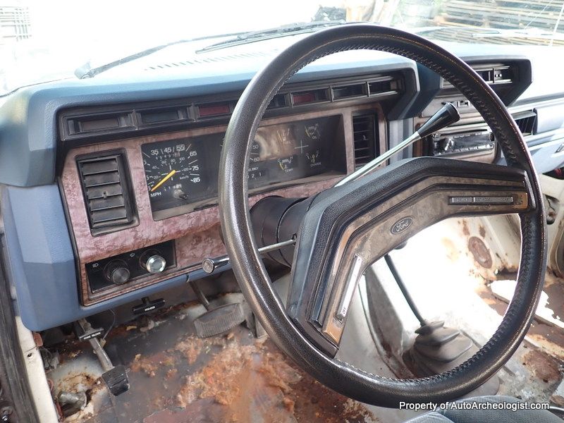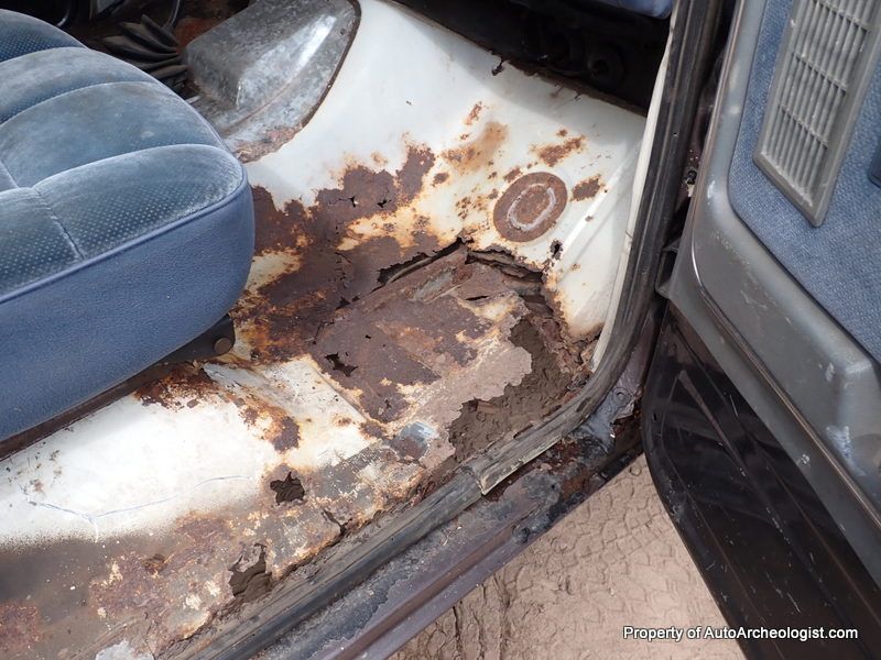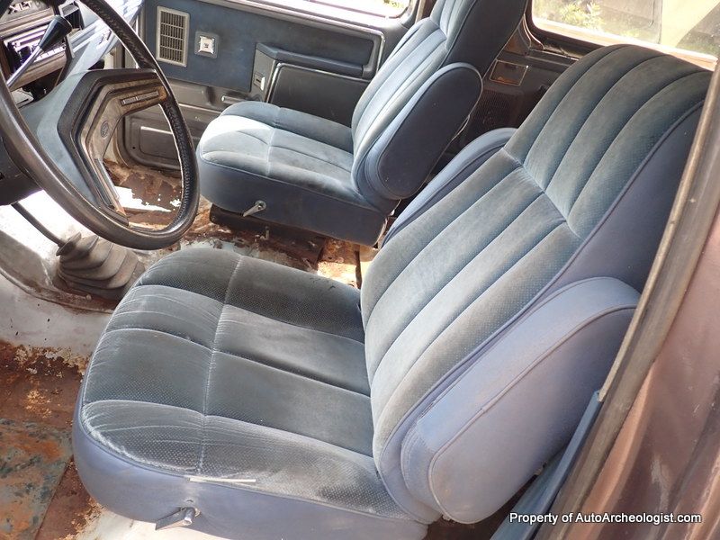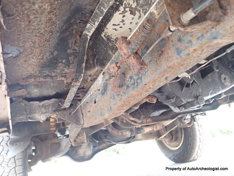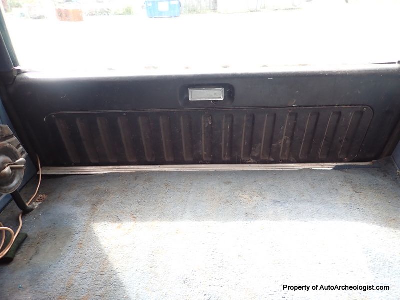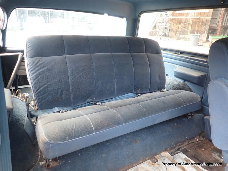 This is an XLT so the interior has a bunch of creature comforts (for the day). Plush, comfy, blue velour captains chairs up front, and a large, folding bench in the back. Power steering, power brakes (Disc F - Drums R), power windows, power locks, wood grain dash and tilt steering wheel, (also in very good condition), AC - the compressor has been removed by a previous owner - C6 auto transmission, which sends the the power to an 8.8" 3:55 Limited slip rear diff. This is a nearly bullet proof driveline. To quiet down the rumble, there is an Alpine stereo head unit. The front carpet was trash due to the missing sections of floor, so that was tossed. The tailgate window does not go down (he has a new motor) and it seems to be missing a hinge and is slightly cocked. The electric door locks work, sort of, the actuator on the driver door is broken and you need to use a small screwdriver and the headlights currently don't come on. These worked when he bought the truck, so not sure what the issue is, all other lights do work, could be bulbs (?) wires to both are good.