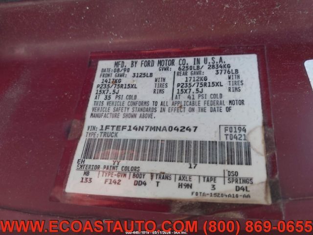 Details > 1991 Ford F-150 4X4 For Sale in Bedford, VA Private Party Sellers Click here to place your ad now! You auta tell them you saw the ad in AutaBuy when you call or email. 1/11 2/11 3/11 4/11 5/11 6/11 7/11 8/11 9/11 10/11 11/11 View 11 Photos View All Add to My Garage Parked in Your Garage! East Coast Auto Source Call: 540-586-5713 Contact Seller: I would like to: Make Offer Check Availability Ask A Question Request More Photos Check Financing Options Send a copy of this message to me Add this listing to my garage Send to Mobile Mileage 85,125 Exterior Color Red And White Stock # N224RBIK VIN 1FTEF14N7MNA04247 1991 Ford F-150 4X4 Description: Full Size Spare Tire,Wheels - Alloy,Bench Seating,Cruise Control,Power Locks,Power Windows,Tilt Steering Wheel,ABS,Four Wheel ABS,Floor Mats,Four Wheel Drive,Power Steering,V8 Cyl. Engine 4X4; GOOD TITLE; RUNS/LOT DRIVES; NORMAL WEAR · Mileage: 85,125 · Color: Red And White Price: $4,995. Mileage 85,125 Exterior Color Red And White Stock # N224RBIK VIN 1FTEF14N7MNA04247 Add to My Garage Parked in Your Garage! Call Seller Message Seller East Coast Auto Source Call: 540-586-5713 Contact Seller: I would like to: Make Offer Check Availability Ask A Question Request More Photos Check Financing Options Send a copy of this message to me Add this listing to my garage Offered for sale by East Coast Auto Source Call 540-586-5713 BEDFORD, VA Mention AutaBuild.com when you call. Price: $4,995. Offered for sale by East Coast Auto Source Call 540-586-5713 BEDFORD, VA Mention AutaBuild.com when you call. [entire inventory] Ask Auta Intelligence The first collector-car AI built directly into a classic car marketplace What colors did these come in? What transmission options did these offer? Tell me more about this model What movies featured cars like this? How many F-150 4X4s were produced in White? Which years was this body style produced? What makes this model year special? What engine options did these come with? Which engines were most common for this year? What nicknames does this model have? Can you show me more repairables for a similar price? What does this VIN number tell me? What factory options were available on this model? When was this model first introduced? How far is this from me? What trim levels were available for this model? How many of these were produced? What makes this model desirable to enthusiasts? What's the typical towing capacity in this configuration? Where is this located? What size tires does this run from the factory? Do you have a similar car to sell? List It Now! Questions about this car? Ask Auta Intelligence for production numbers, available options, etc. · Subscribe to AutaBuy! · Send a Gift Subscription Notice to a Friend
