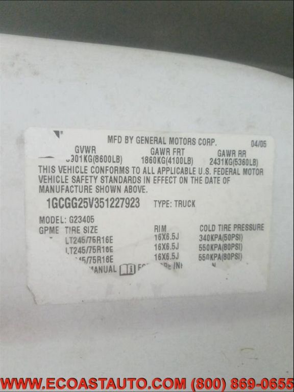 Details > 2005 Chevrolet Express Cargo Van G2500 For Sale in Bedford, VA Private Party Sellers Click here to place your ad now! You auta tell them you saw the ad in AutaBuy when you call or email. 1/9 2/9 3/9 4/9 5/9 6/9 7/9 8/9 9/9 View 9 Photos View All Add to My Garage Parked in Your Garage! East Coast Auto Source Call: 540-586-5713 Contact Seller: I would like to: Make Offer Check Availability Ask A Question Request More Photos Check Financing Options Send a copy of this message to me Add this listing to my garage Send to Mobile Mileage 233,336 Exterior Color Summit White Stock # G721REIK VIN 1GCGG25V351227923 Estimated Monthly Payment $118 mo Apply Now J.J. Best Banc & Co. 2005 Chevrolet Express Cargo Van G2500 Description: Airbag - Driver,Psngr Arbg On/Off Cntrl,12V Power Outlet,Four Wheel ABS,4-Wheel Disc Brakes,Rear Wheel Drive,Vehicle Anti-theft,V8 Cyl. Engine,Intermittent Wipers,Power Steering RUNS/LOT DRIVES; HAIL DAMAGE; REBUILT TITLE · Mileage: 233,336 · Color: Summit White Price: $7,795. Price: $6,795. Mileage 233,336 Exterior Color Summit White Stock # G721REIK VIN 1GCGG25V351227923 Estimated Monthly Payment $118 mo Apply Now J.J. Best Banc & Co. Add to My Garage Parked in Your Garage! Call Seller Message Seller East Coast Auto Source Call: 540-586-5713 Contact Seller: I would like to: Make Offer Check Availability Ask A Question Request More Photos Check Financing Options Send a copy of this message to me Add this listing to my garage Offered for sale by East Coast Auto Source Call 540-586-5713 BEDFORD, VA Mention AutaBuild.com when you call. Price: $7,795. Price: $6,795. Offered for sale by East Coast Auto Source Call 540-586-5713 BEDFORD, VA Mention AutaBuild.com when you call. [entire inventory] Do you have a similar car to sell? List It Now! Questions about this car? Ask Auta Intelligence for production numbers, available options, etc. · Subscribe to AutaBuy! · Send a Gift Subscription Notice to a Friend