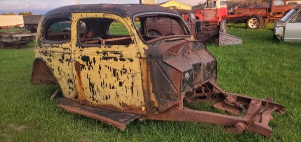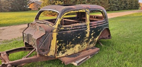 Here is a great one for your next rod project! Comes with all the garnish mouldings and windshield frame. Has some lower body rust and will need front floors and rear footwell floor pieces. Rear floor looks good. Comes with a good N.D. Title and we will assist with transport. $2,200