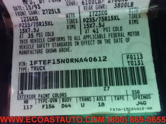 Details > 1994 Ford F-150 For Sale in Bedford, VA Private Party Sellers Click here to place your ad now! You auta tell them you saw the ad in AutaBuy when you call or email. 1/12 2/12 3/12 4/12 5/12 6/12 7/12 8/12 9/12 10/12 11/12 12/12 View 12 Photos View All Add to My Garage Parked in Your Garage! East Coast Auto Source Call: 540-586-5713 Contact Seller: I would like to: Make Offer Check Availability Ask A Question Request More Photos Check Financing Options Send a copy of this message to me Add this listing to my garage Send to Mobile Mileage 162,599 Exterior Color Blue Stock # J910REEK VIN 1FTEF15N0RNA40612 1994 Ford F-150 Description: Full Size Spare Tire,Airbag - Driver,12V Power Outlet,Four Wheel ABS,V8 Cyl. Engine,Floor Mats,Intermittent Wipers,Bench Seating,Power Steering RUNS/LOT DRIVES; REAR AND RIGHT SIDE DAMAGE; PARTS AVAILABLE · Mileage: 162,599 · Color: Blue Price: $6,795. Price: $6,495. Mileage 162,599 Exterior Color Blue Stock # J910REEK VIN 1FTEF15N0RNA40612 Add to My Garage Parked in Your Garage! Call Seller Message Seller East Coast Auto Source Call: 540-586-5713 Contact Seller: I would like to: Make Offer Check Availability Ask A Question Request More Photos Check Financing Options Send a copy of this message to me Add this listing to my garage Offered for sale by East Coast Auto Source Call 540-586-5713 BEDFORD, VA Mention AutaBuild.com when you call. Price: $6,795. Price: $6,495. Offered for sale by East Coast Auto Source Call 540-586-5713 BEDFORD, VA Mention AutaBuild.com when you call. [entire inventory] Ask Auta Intelligence The first collector-car AI built directly into a classic car marketplace How many F-150s were produced in Blue? What factory options were available on this model? What makes this model year special? Can you show me more pickups/trucks for a similar price? What does this VIN number tell me? What colors did these come in? What transmission options did these offer? When was this model first introduced? What size tires does this run from the factory? How many of these were produced? How far is this from me? What engine options did these come with? Where is this located? Tell me the history on this model Which years was this body style produced? What trim levels were available for this model? Which engines were most common for this year? What makes this model desirable to enthusiasts? What's the typical towing capacity in this configuration? What movies featured cars like this? What nicknames does this model have? Do you have a similar car to sell? List It Now! Questions about this car? Ask Auta Intelligence for production numbers, available options, etc. · Subscribe to AutaBuy! · Send a Gift Subscription Notice to a Friend